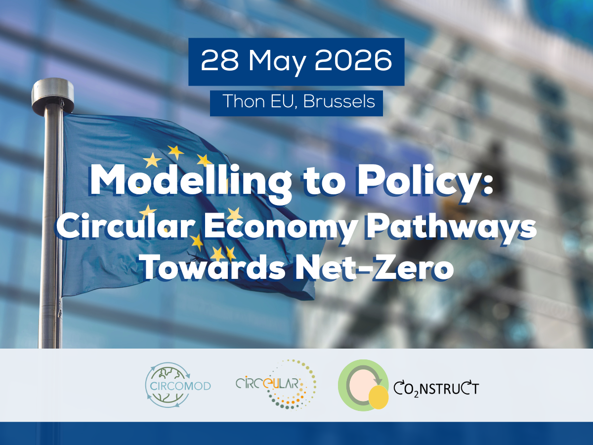 The CIRCOMOD, CircEUlar, and CO2NSTRUCT Horizon Europe research projects are hosting their final joint conference “Modelling to Policy: Circular Economy Pathways Towards Net-Zero”, taking place on 28 May 2026, from 13:00 to 18:00 CEST, at Thon EU in Brussels. This interactive event will delve into emerging key messages on circular economy strategies, identify key priorities for further research and present policy recommendations supporting an EU low-carbon transition. The day will close with a networking session over drinks, giving participants the chance to connect, exchange ideas and continue the conversation.